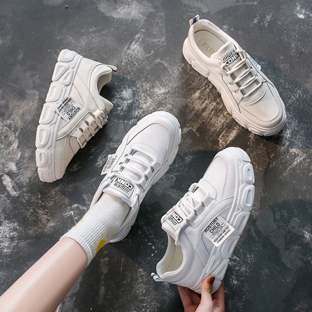 Spring And Summer New White Shoes Women Breathable Leather Thick-Soled Casual Sports Running Shoes